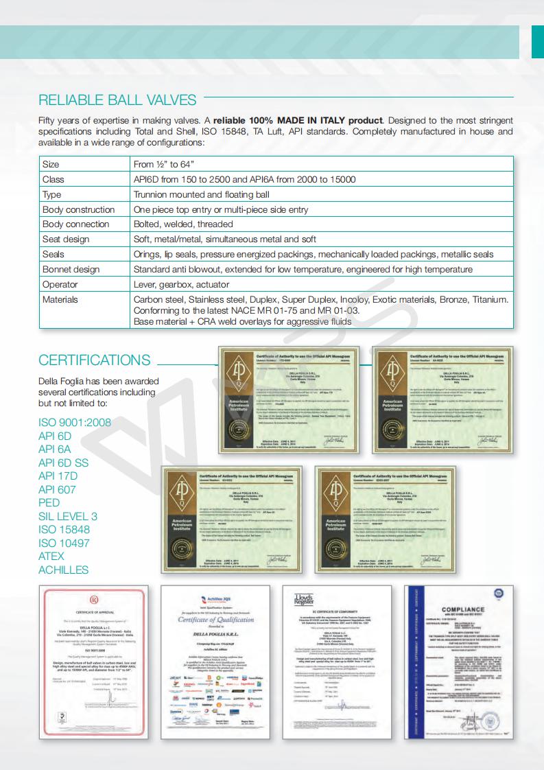 | 意大利DELLA FOGLIA球閥的技術參數 |
