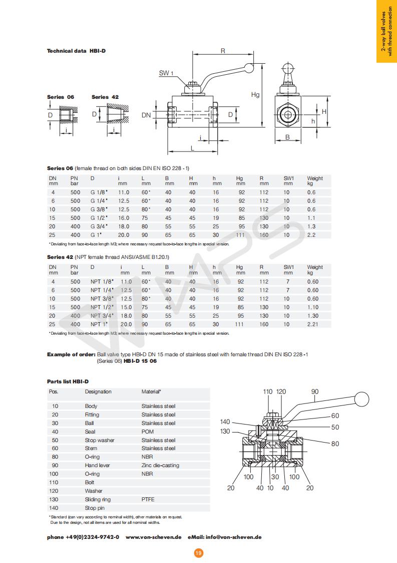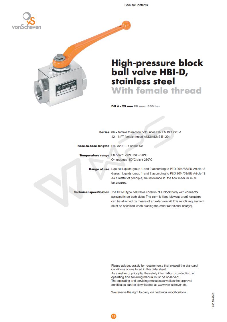 | 德國Von Scheven原裝進口板式內螺紋不銹鋼高壓球閥的技術參數 |