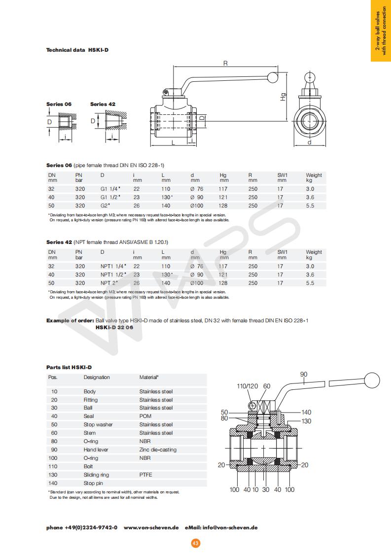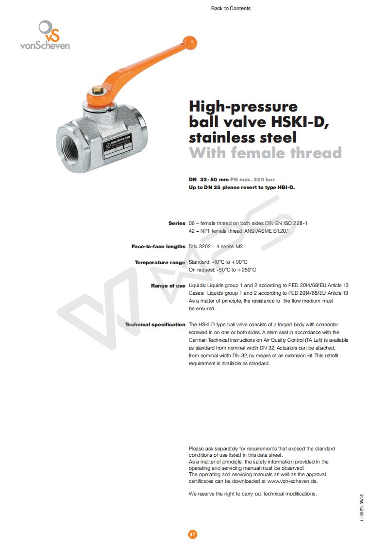 | Von Scheven內螺紋不銹鋼高壓球閥的各項技術參數 |